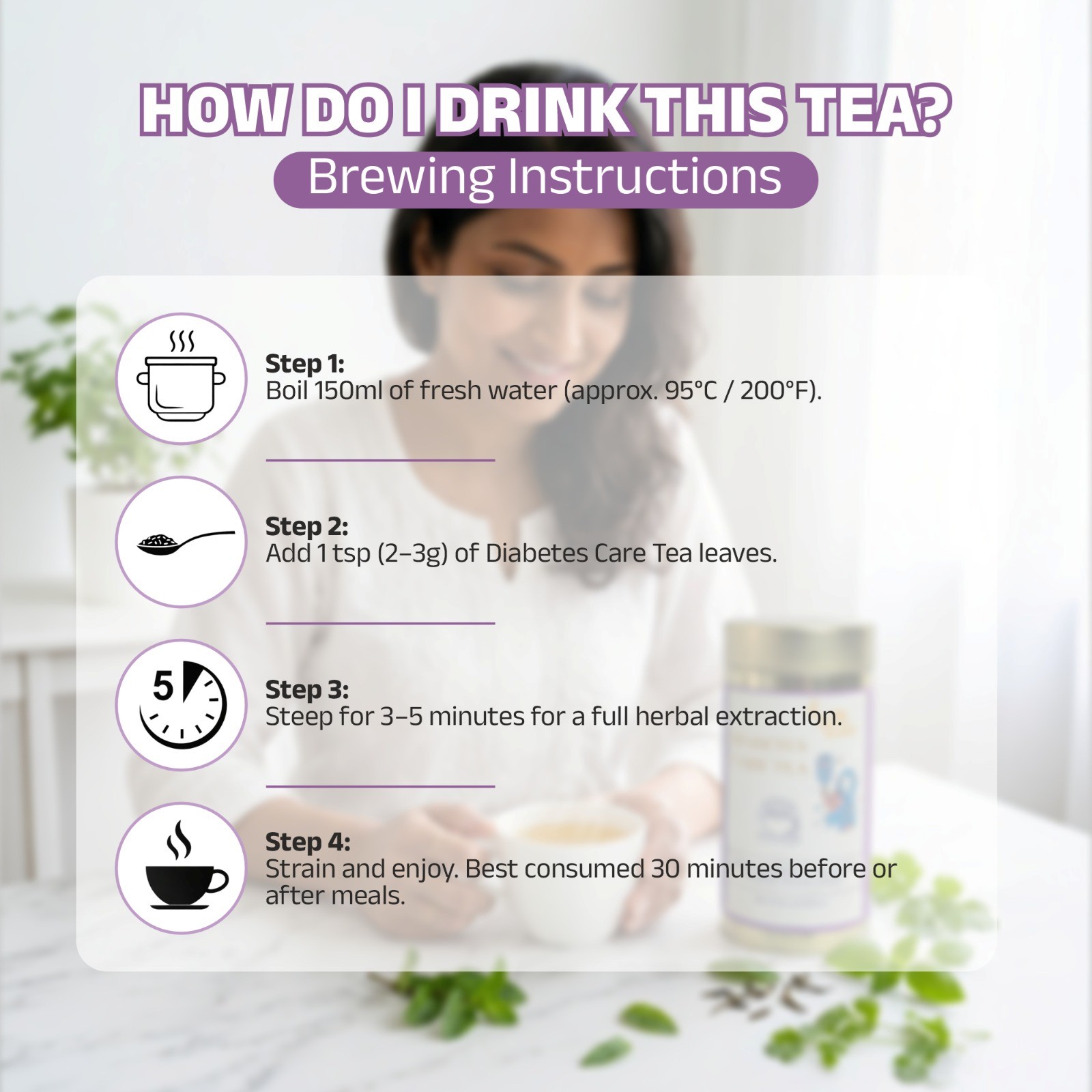 Brew 1 teaspoon at 80–85°C for 2–3 minutes. Enjoy without milk, and sweeten only if your dietary plan allows. Low in caffeine and antioxidant-friendly, this tea is designed to be a gentle, everyday companion.