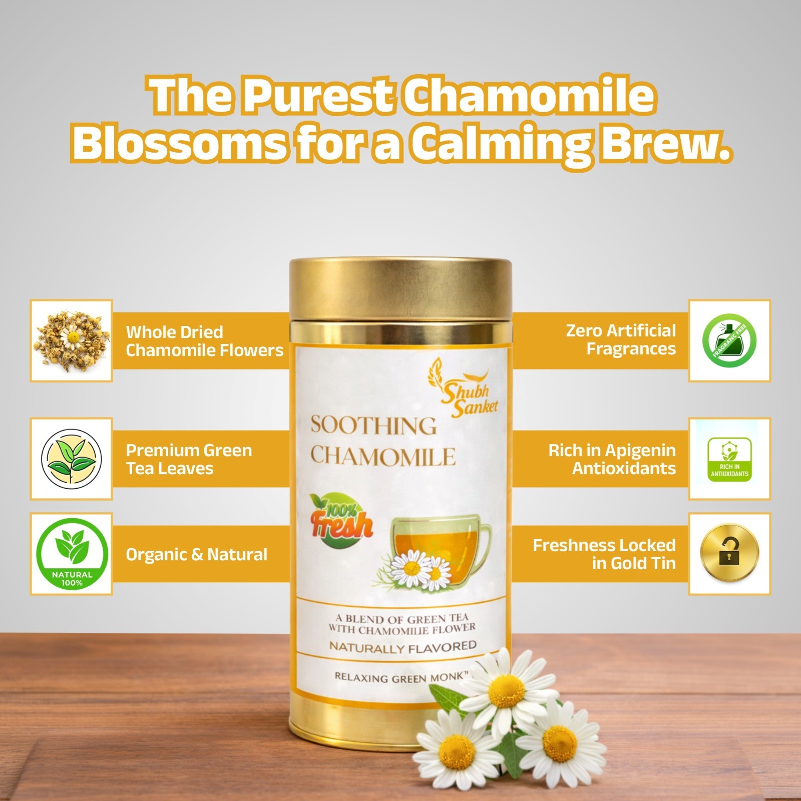 Shubh Sanket Soothing Chamomile Green Tea is a gentle, calming blend that pairs premium green tea with chamomile blossoms. The result is a soft floral aroma and a tranquil flavour—ideal for late afternoons or evenings when you want to unwind. The green tea base provides a clean, structured body while chamomile lends a comforting, mellow finish.
