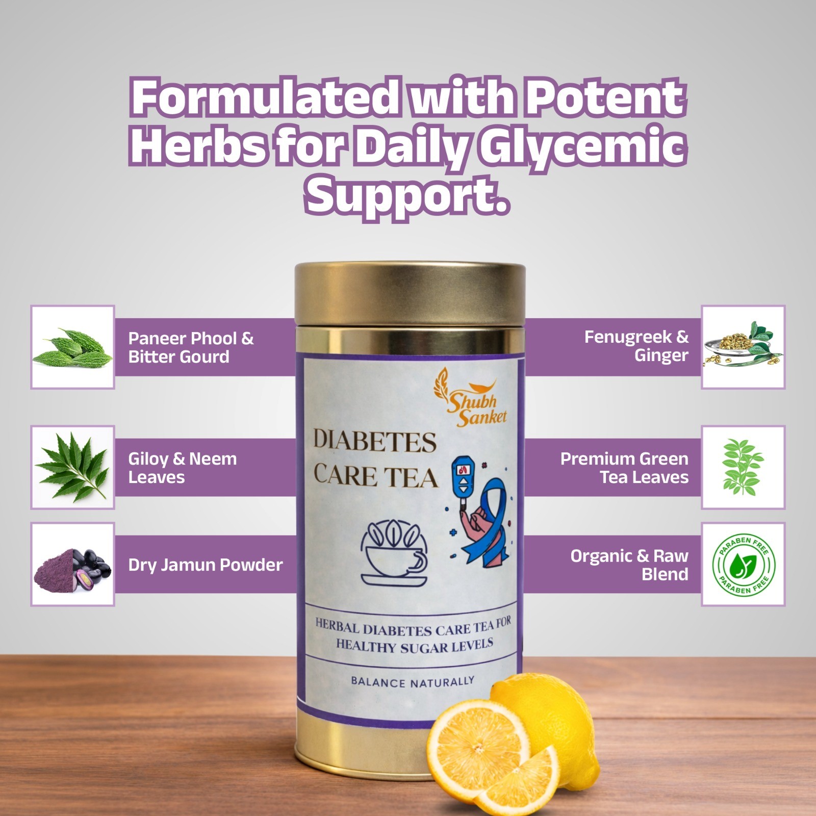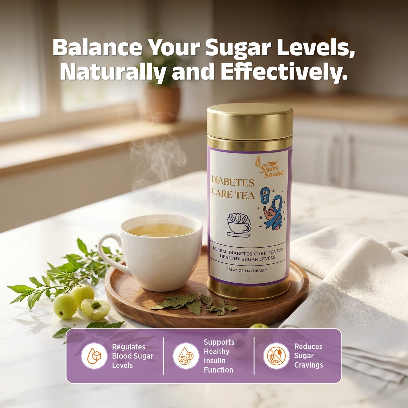Shubh Sanket Diabetes Care Tea is a supportive wellness blend featuring green tea, gymnema, fenugreek, and cinnamon—herbs traditionally used in balanced lifestyles. The taste is mild and comforting, with a soft spice profile that pairs well with mindful diets and daily routines.
